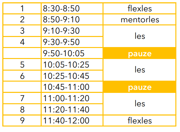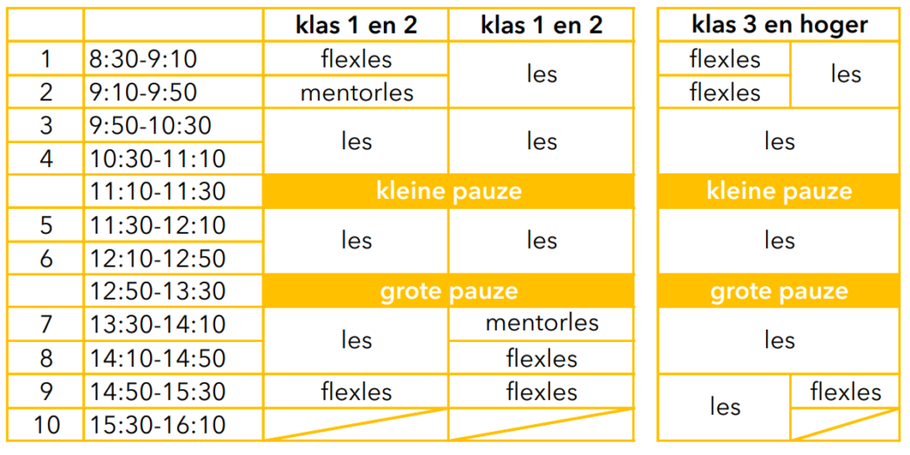 Soms duren de lessen geen 80 maar 40 minuten, bijvoorbeeld op dagen dat er rapportvergaderingen zijn. De flexuren zijn dan 20 minuten. Het rooster ziet er dan zo uit: